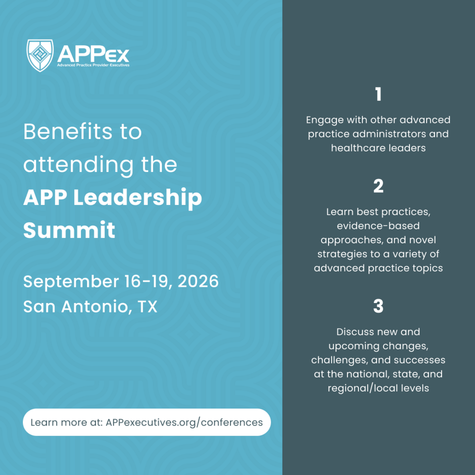 APPex’s annual conference held in September--the Advanced Practice Provider (APRN & PA) Leadership Summit--is the first and largest conference specifically geared towards advanced practice leadership and administrative topics.